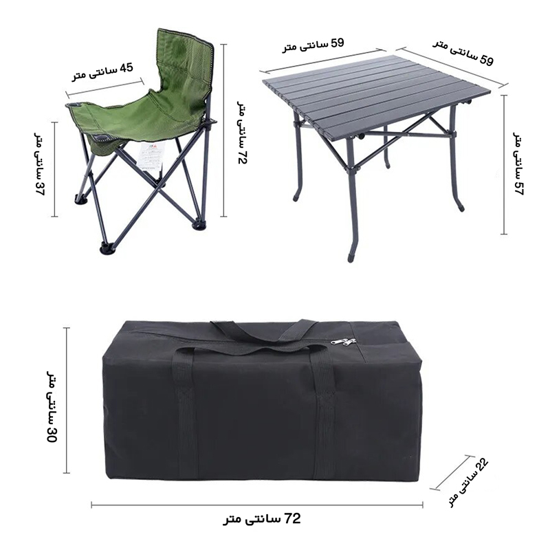 پایههای فلزی صندلیها نیز به گونهای طراحی شدهاند که ضمن ایجاد استحکام لازم، سبک و قابل حمل باشند. این پایهها تحمل وزن تا 100 کیلوگرم را دارند که به شما اطمینان میدهد صندلیها در استفاده طولانی مدت دچار شکستگی یا خم شدن نخواهند شد.میز این ست با رویهای از جنس آلومینیوم عرضه میشود که هم سبک و هم مقاوم است. این ویژگی باعث میشود میز به راحتی قابل حمل باشد و در عین حال توانایی تحمل وزن مورد نیاز برای قرار دادن غذا، وسایل کمپینگ و سایر لوازم شما را داشته باشد. با این طراحی کارآمد، میتوانید هر آنچه که نیاز دارید را بر روی میز قرار دهید و از فضای کاربردی آن بهرهمند شوید.