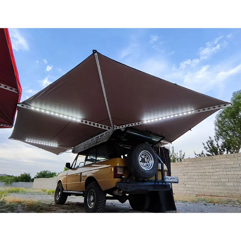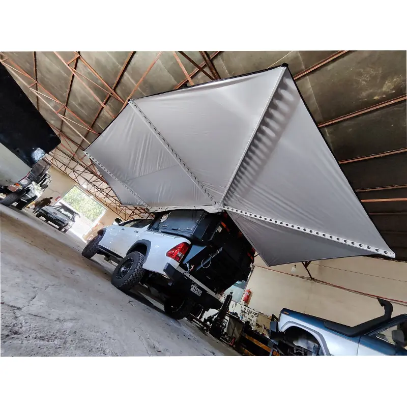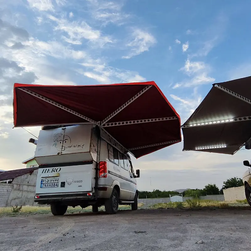 طرح خفاشی با ۷ بازوی شعاعی فلزی، امکان باز شدن سایبان تا حدود ۲۷۰ درجه را فراهم میکند؛ این یعنی بخش بزرگی از اطراف و عقب خودرو تحت پوشش قرار میگیرد. چنین پوششی فضای کافی برای نشستن، استراحت، آشپزی، چیدمان تجهیزات یا حتی کارهای فنی سبک در کنار خودرو ایجاد میکند. برخلاف سایبانهای ساده خطی، این ساختار تعادل بهتری در برابر باد دارد و توزیع فشار روی بازوها باعث پایداری بیشتر در شرایط محیطی متغیر میشود.