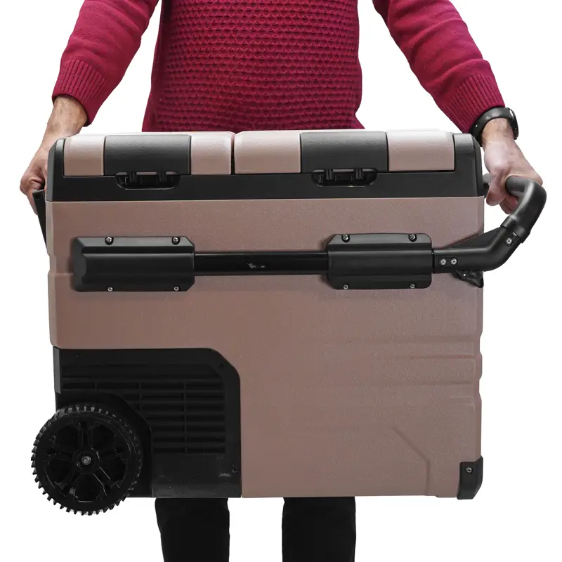 حمل این یخچال و فریزر بسیار راحت است. با چرخ‌های مقاوم و دسته بازشونده قابل‌تنظیم، جابه‌جایی آن حتی زمانی که پر از مواد غذایی است، ساده و آسان می‌شود. این ویژگی باعث می‌شود که در سفرها، کمپینگ و حتی استفاده‌های روزمره، حمل‌ونقل آن به‌هیچ‌وجه مشکلی ایجاد نکند.