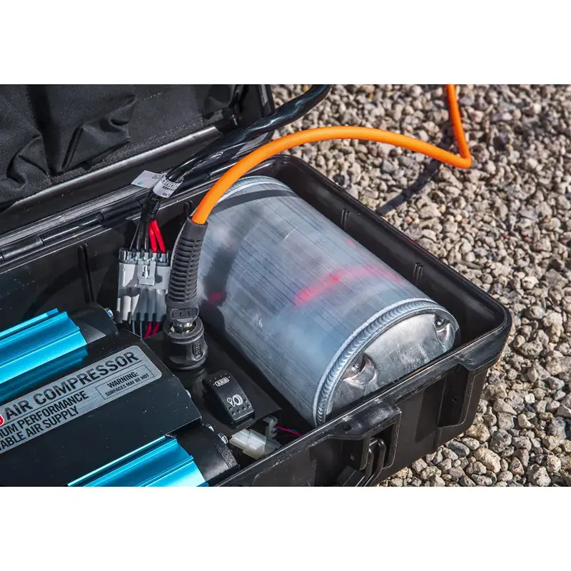 وجود مخزن تحت فشار ۴ لیتری، تفاوت اصلی این کمپرسور با مدلهای سادهتر است. این مخزن باعث یکنواخت شدن جریان هوا، کاهش فشار لحظهای روی موتور و افزایش بازده کلی سیستم میشود. در عمل، این یعنی باد کردن سریعتر، فشار پایدارتر و عملکرد مطمئنتر هنگام استفاده از ابزارهای بادی یا تنظیم دقیق باد تایر است. در شرایط اضطراری، زمانی که زمان و انرژی اهمیت دارد، این مخزن کمک میکند عملیات باد کردن بدون وقفه و با دقت بیشتری انجام شود، چیزی که در کمپینگ حرفهای و آفرود سنگین کاملاً محسوس است.