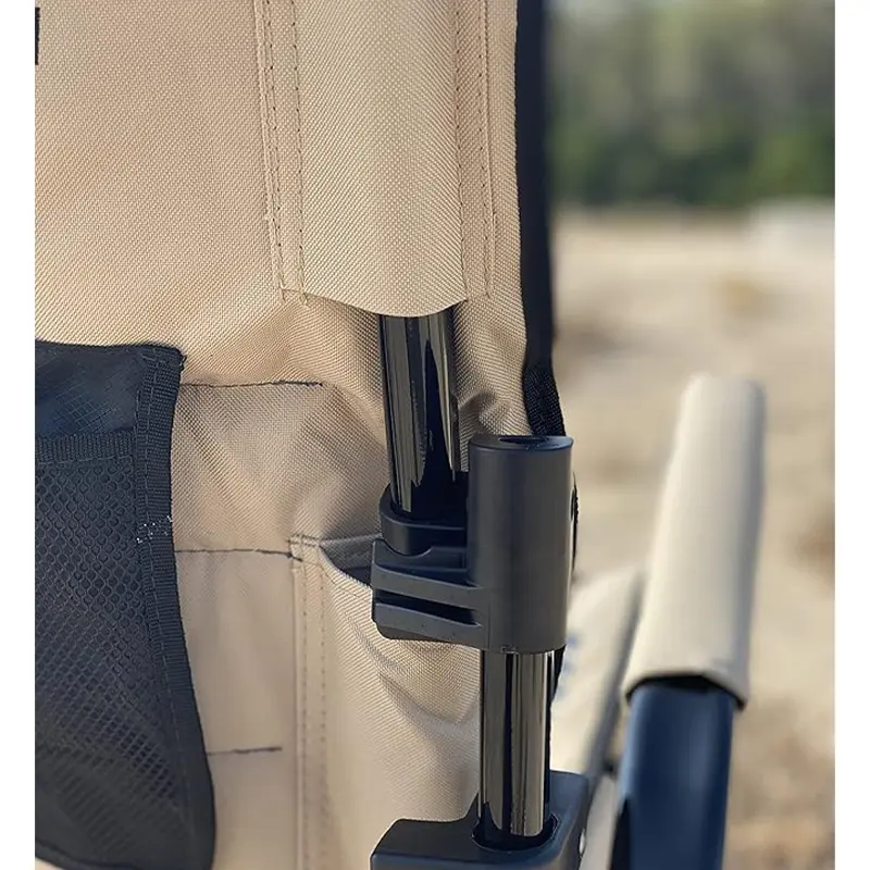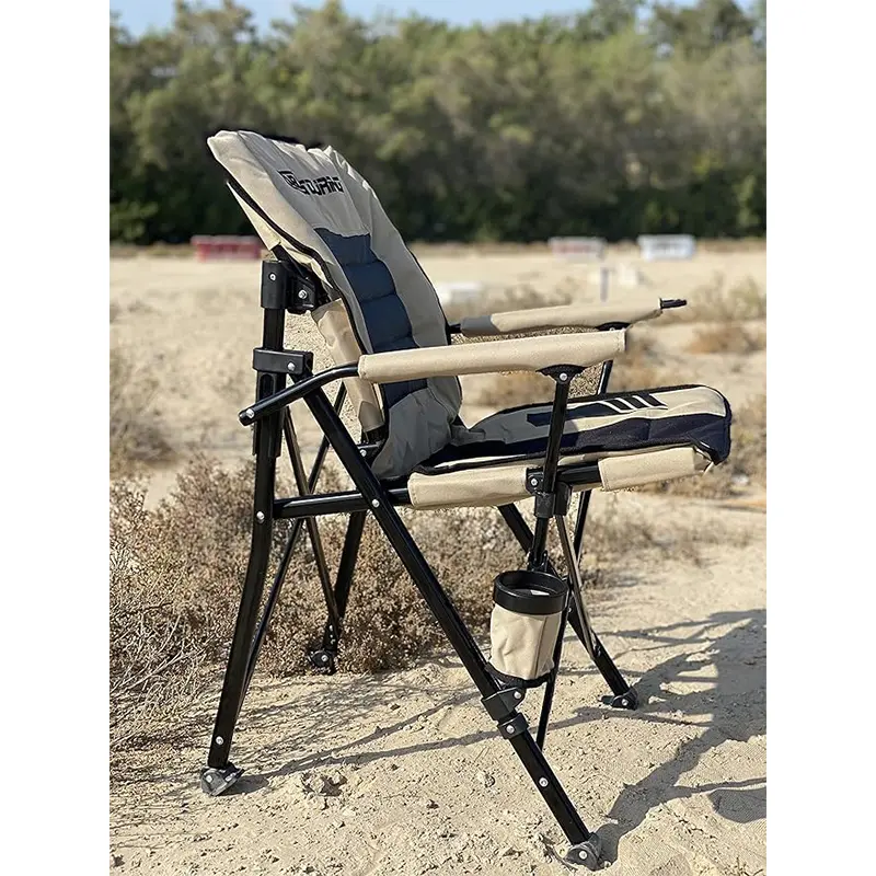 بدنه اصلی از پارچه مقاوم و باکیفیت ساخته شده که هم در برابر کشش و سایش مقاومت بالایی دارد و هم بهخوبی در برابر رطوبت یا گردوخاک از خود محافظت میکند. شاسی و فریم فلزی صندلی با ساختاری مهندسیشده طراحی شدهاند تا در کنار وزن نسبتاً مناسب، ظرفیت تحمل وزن تا ۱۵۰ کیلوگرم را تضمین کنند. دستهها با فوم نرم روکش شدهاند تا در هنگام استفاده حس آسایش بیشتری ایجاد کنند و تکیهگاههای استاندارد بازو را شکل دهند.