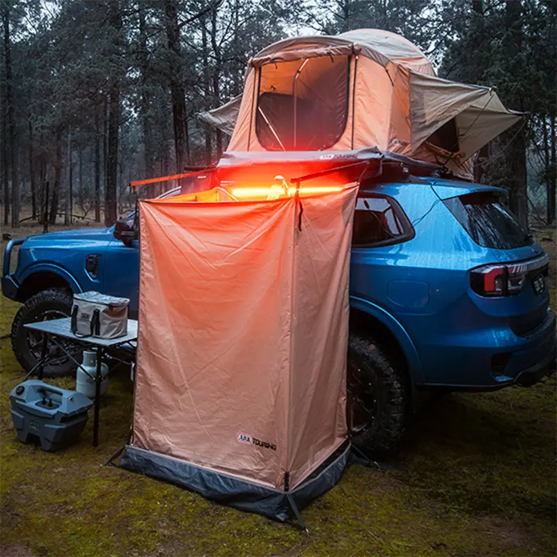 اتاقک حمام ARB یک کابین خصوصی و جمعوجور برای دوشگرفتن، تعویض لباس و استقرار سرویس بهداشتی پرتابل در کمپ است که با سازوکار میلهای، در کمتر از ۵ دقیقه نصب میشود و فضای تمیز و محفوظی کنار خودرو ایجاد میکند. بدنه از پارچه با روکش نقرهای 200 GSM ساخته شده و در برابر آب و تابش UV مقاوم است تا در بارانهای کوتاهمدت و آفتاب مستقیم، عملکرد پایدار داشته باشد. کفی از جنس پلیاتیلن مقاوم طراحی شده و بهکمک نقاط مهار، روی زمین محکم میشود؛ شلنگ تخلیهی آب، خروج آب مصرفی را ساماندهی میکند و نظافت محل را آسان میسازد. سقف کابین قابل جداسازی است تا برحسب شرایط هوا، تهویه یا پوشش کامل را انتخاب کنید و کاور محافظ همراه، در زمان جمعآوری از پارچه و اتصالات محافظت میکند.