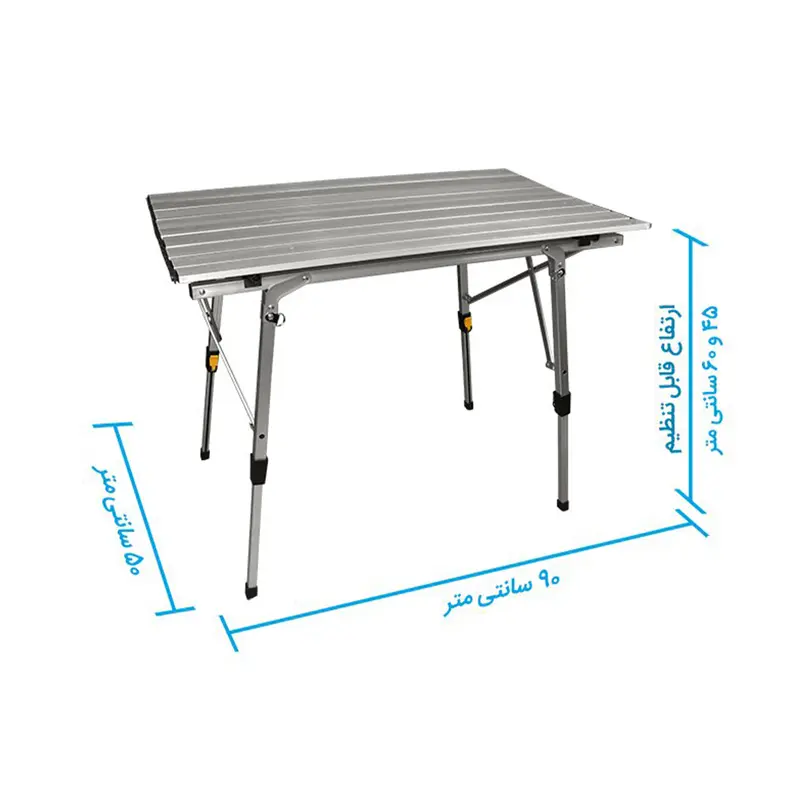 با استفاده از مکانیزم کشویی و قفل پایهها میتوان ارتفاع میز را تنظیم کرد.