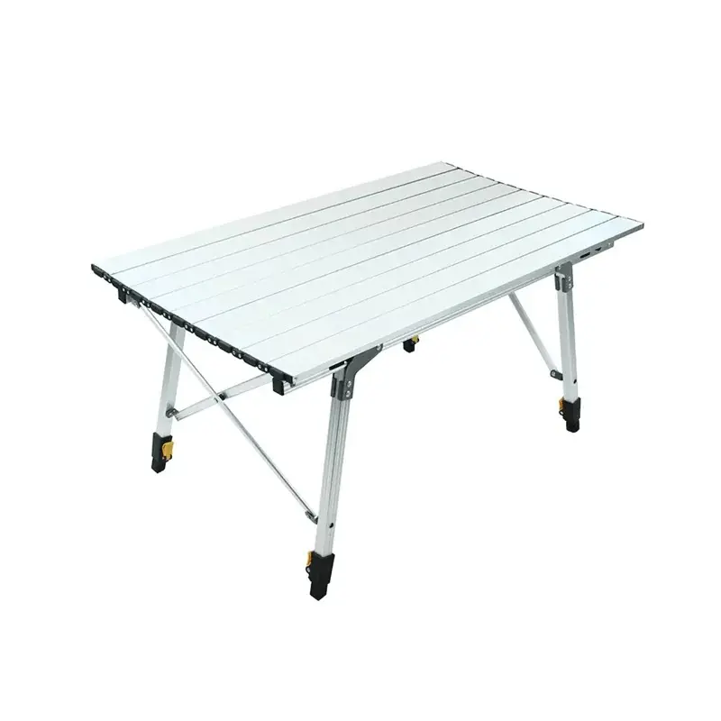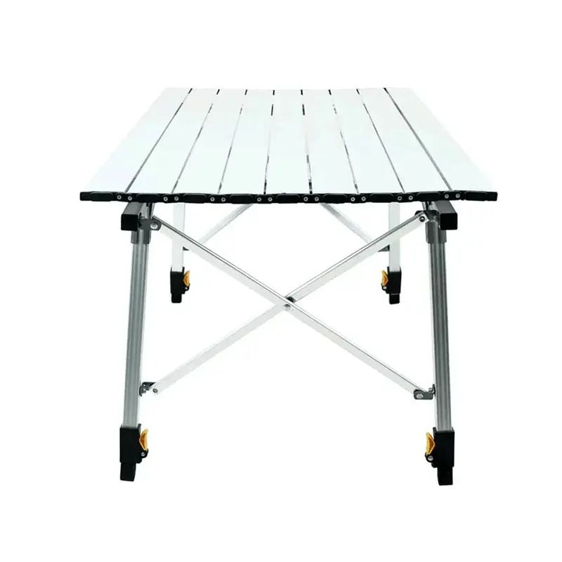 رویه میز آلومینیومی تاشو به صورت جداگانه تا میشود و پایههای آن نیز بهصورت جداگانه قابل تا شدن هستند و پس از تا شدن فضای کمی را اشغال میکنند. پایهها و رویه میز از جنس آلومینیوم هستند و در نتیجه میز از استحکام بالا و وزن کمی برخوردار است.