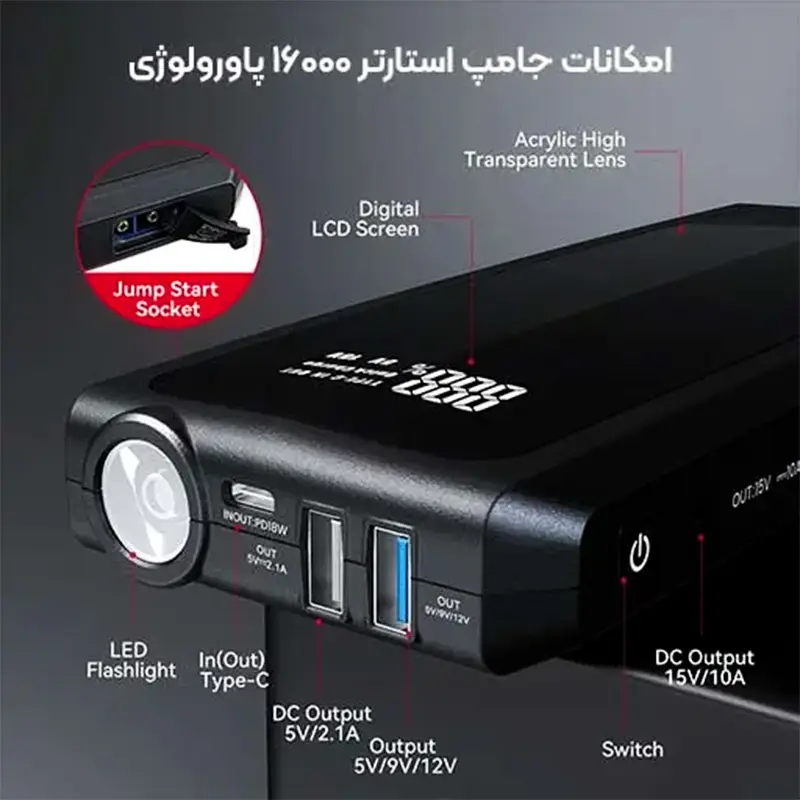 جامپ استارتر پاورلوژی PPBCHA29 یک منبع انرژی قابلحمل و قدرتمند برای شرایط اضطراری و سفرهای آفرودی است که با طراحی حرفهای و ظرفیت بالای باتری، توانایی روشنکردن موتور انواع خودرو و موتورسیکلت را دارد. این دستگاه با بهرهمندی از ظرفیت ۱۶۰۰۰ میلیآمپر ساعت و شدت جریان استارت ۵۰۰ آمپر، توانایی استارت سریع وسایل نقلیهی بنزینی و دیزلی را دارد و در مواقع اضطراری یا افت ولتاژ باتری، میتواند عملکردی سریع و قابلاطمینان ارائه دهد. همچنین، حداکثر توان خروجی آن در حالت پیک به ۱۲۰۰ آمپر میرسد که نشان از توان بالای آن در شرایط بحرانی دارد.
