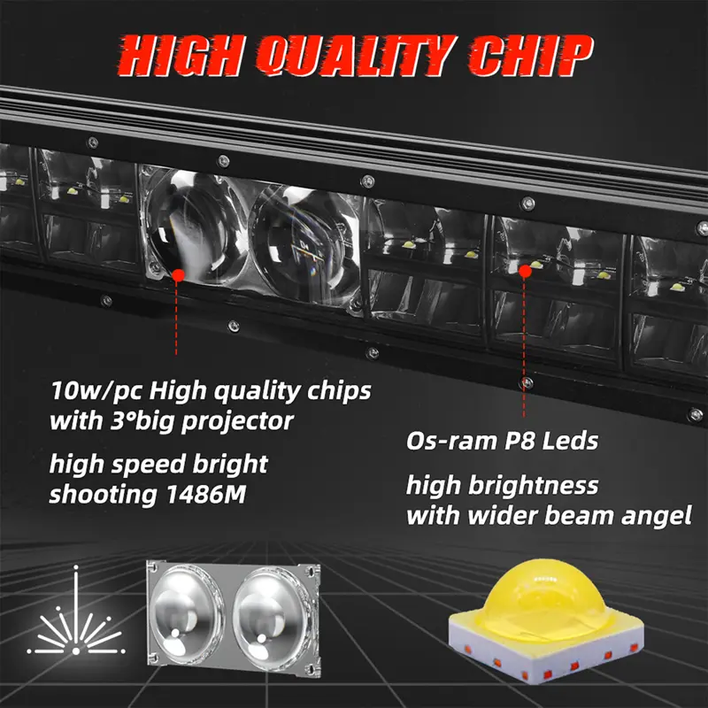 چیپست و LEDهای استفادهشده از برند معتبر OSRAM آلمان هستند؛ برندی که دقت نوری، شدت روشنایی و ماندگاری آن در سطح جهانی شناخته شده است. نتیجهی این انتخاب، تولید نوری سفید و شفاف است که در شرایط بارانی، مهآلود یا جادههای بیابانی به وضوح مسیر کمک میکند. شدت نور این مدل به گونهای طراحی شده که هم دید دوربرد لیزری و هم پوشش عرضی قابل توجهی ارائه دهد، بنابراین هم مسیر مستقیم و هم حاشیههای جاده روشن میشوند.