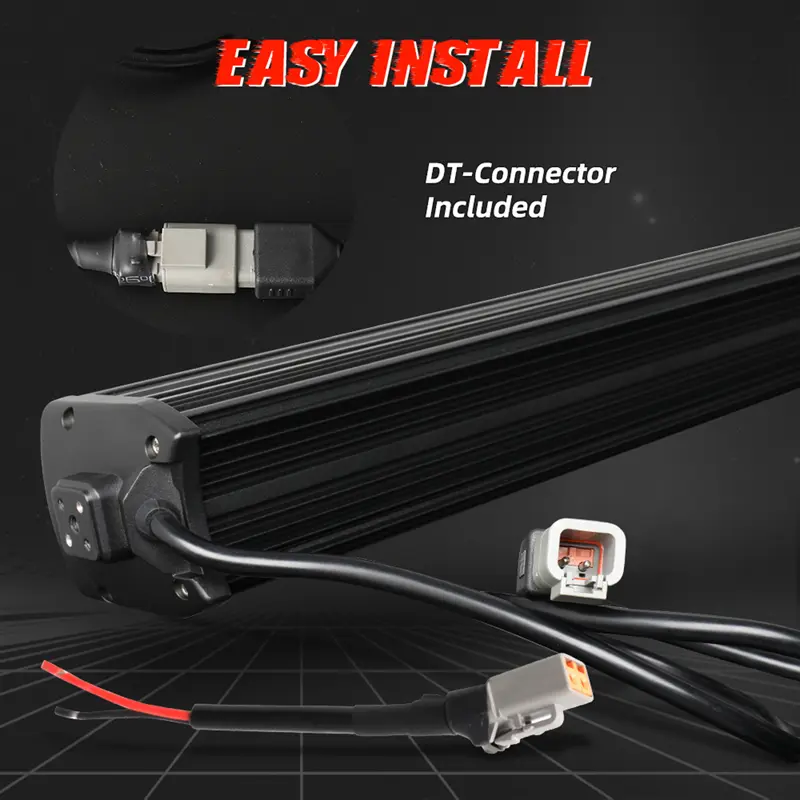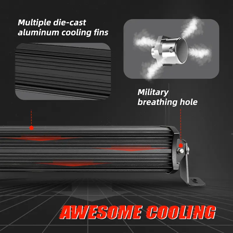 بدنهی این لایت بار از آلومینیوم مشکی رنگ ساخته شده که هم سبک است و هم در برابر ضربه و حرارت مقاومت بالایی دارد. پرههای خنککننده آلومینیومی روی بدنه، دمای کاری LEDها را در سطحی پایدار نگه میدارند و عمر مفید سیستم را افزایش میدهند. طول عمر اسمی این چراغ تا ۵۰ هزار ساعت اعلام شده که در مقایسه با چراغهای معمولی، برتری چشمگیری دارد و به معنای سالها استفاده بدون افت کیفیت است.
