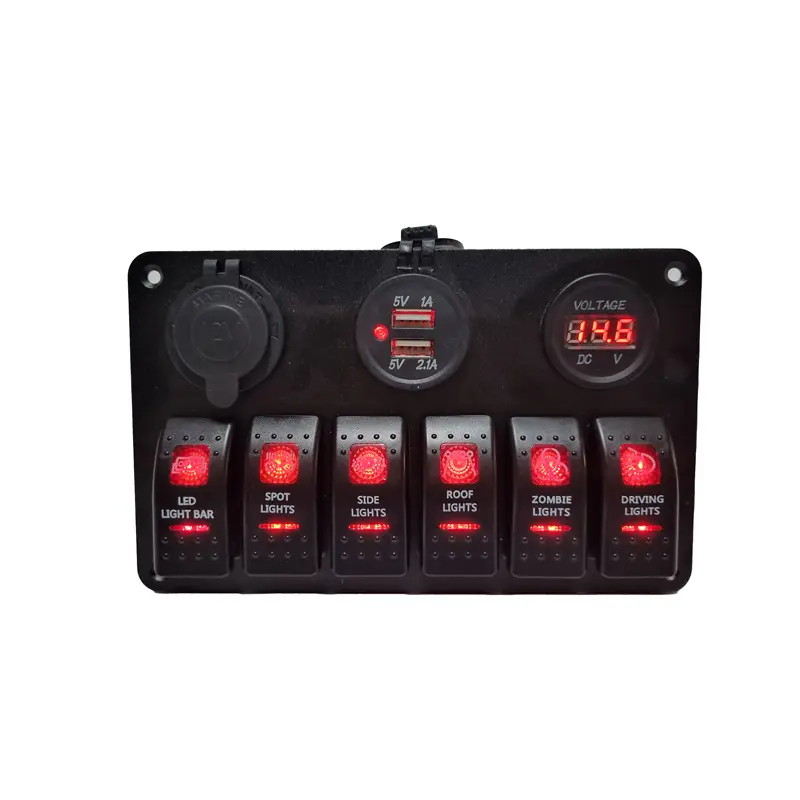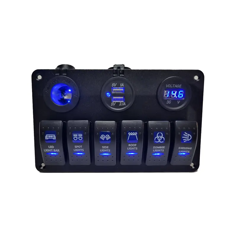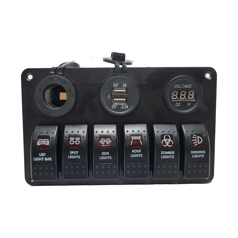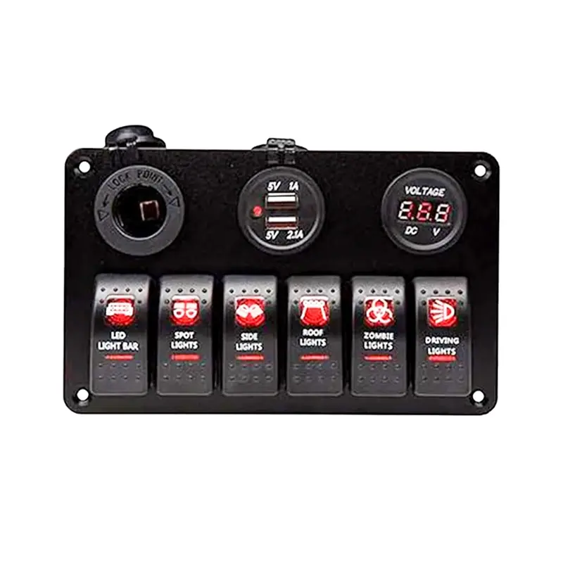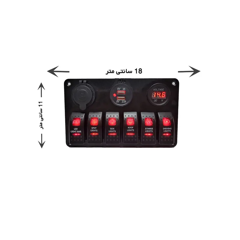پنل 3 تایی توکار ولتمتر- شارژر USB – خروجی 12 ولت فندکی + صفحه کلید کلنگی 6 تایی با نور پس زمینه قرمز و آبی، یک ابزار کامل و پیشرفته برای کنترل و مدیریت تجهیزات الکتریکی خودرو، مناسب برای آفرود، مسافرت و استفاده روزمره است.