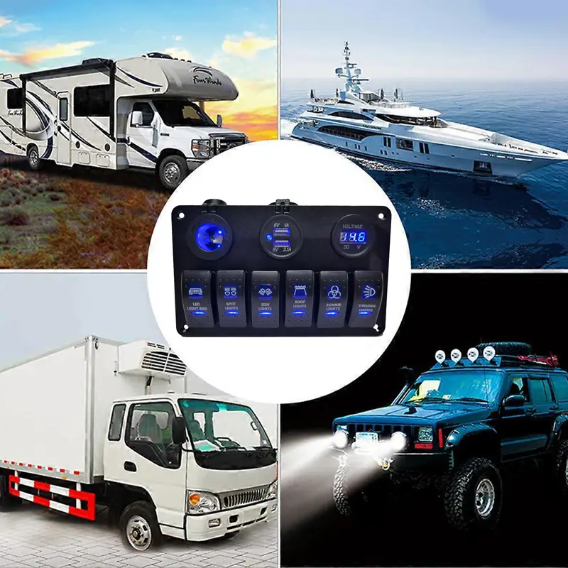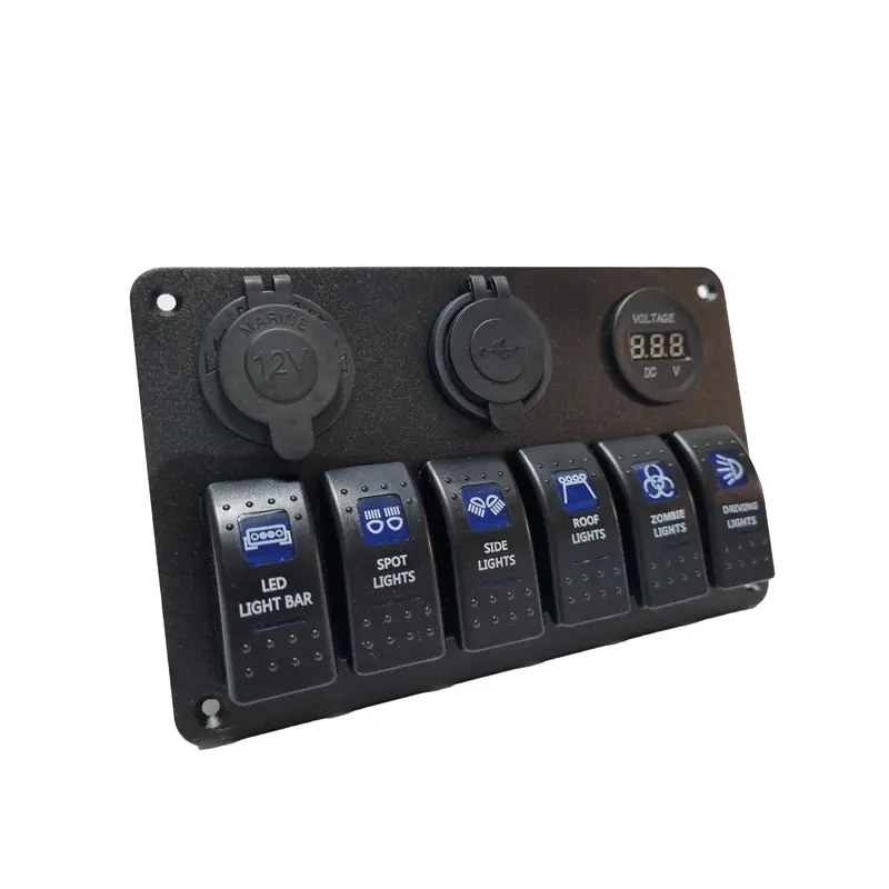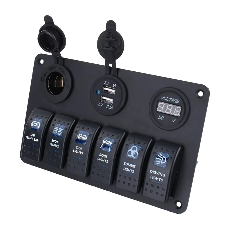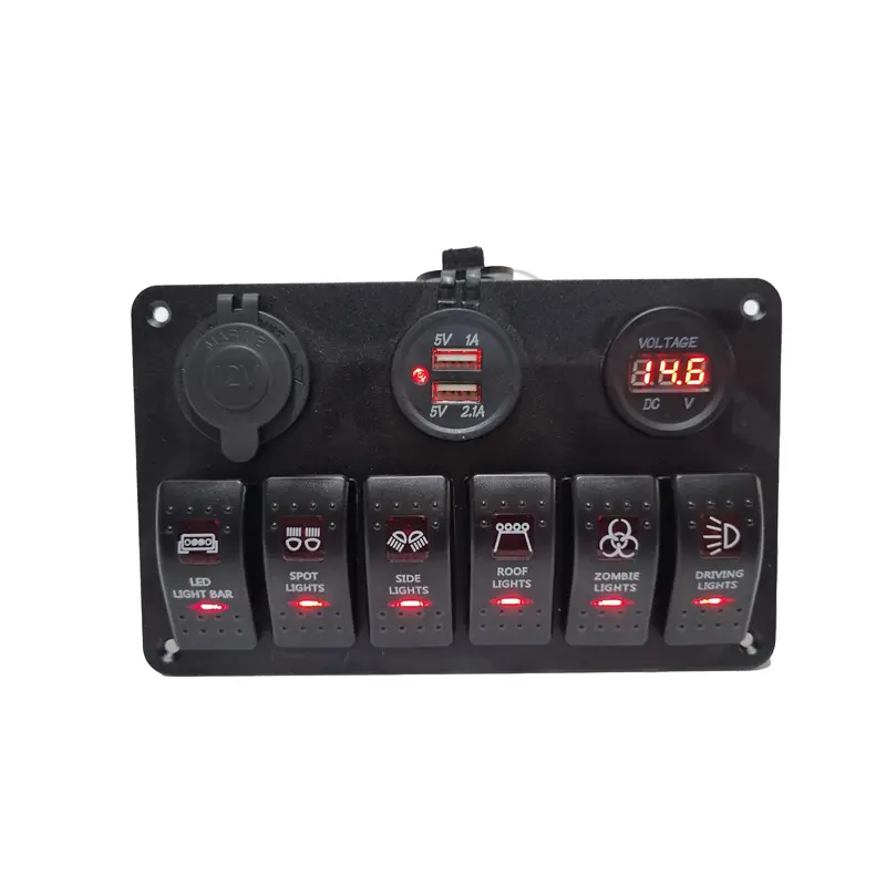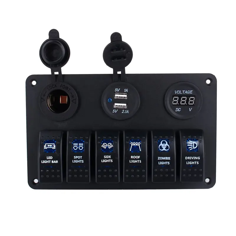 پنل 3 تایی توکار ولتمتر- شارژر USB – خروجی 12 ولت فندکی + صفحه کلید کلنگی 6 تایی با نور پس زمینه قرمز و آبی، یک ابزار کامل و پیشرفته برای کنترل و مدیریت تجهیزات الکتریکی خودرو، مناسب برای آفرود، مسافرت و استفاده روزمره است.