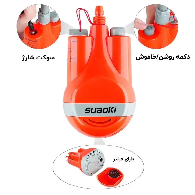 مجهزبودن به فیلتر مخصوص برای استفاده از منابع طبیعی مانند آب نهر، امکان استفاده در شرایط محیطی مختلف را فراهم می‌سازد. همچنین وجود قلاب و ساکشن برای آویزان‌کردن دوش یا اتصال آن به سطوح صاف، راحتی بیشتری را در نصب و استفاده فراهم می‌کند. کلیه اتصالات الکتریکی دستگاه ضدآب طراحی شده‌اند تا خیالتان از ایمنی آن در محیط‌های مرطوب آسوده باشد.