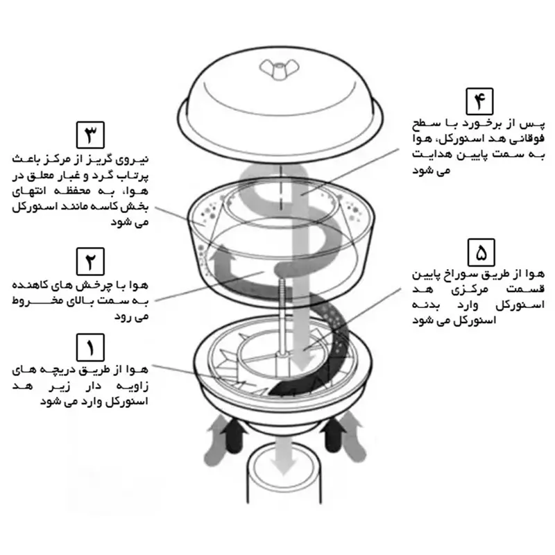 - ایجاد گردش هوا برای جداسازی گردوخاک از ورودی