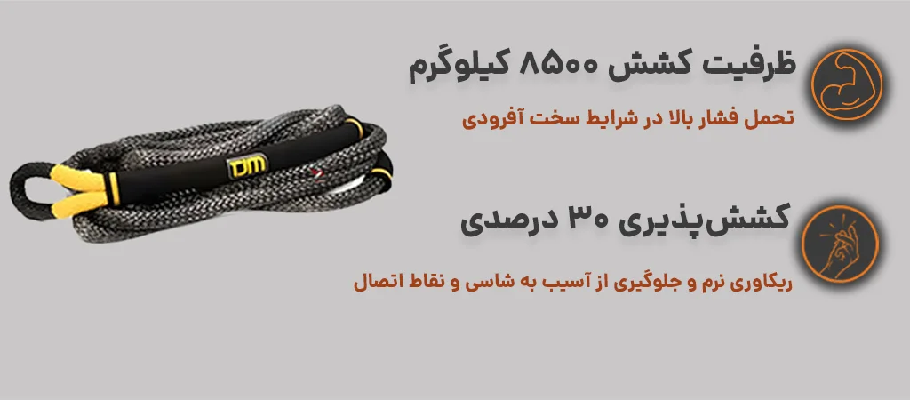 در میان انواع طنابهای ریکاوری، طناب سنتتیک تی جی ام یک گزینه حرفهای و مطمئن برای رانندگان آفرودی است. این طناب به صورت سفارشی طراحی شده تا حداکثر ایمنی و عملکرد را در شرایط سخت ارائه دهد. ظرفیت کشش بالا، انعطاف مطلوب و طراحی ویژه آن، امکان ریکاوری روان و بدون آسیب به شاسی و نقاط اتصال خودرو را فراهم میکند و تجربه آفرود را برای راننده بسیار ایمن و لذتبخش مینماید.