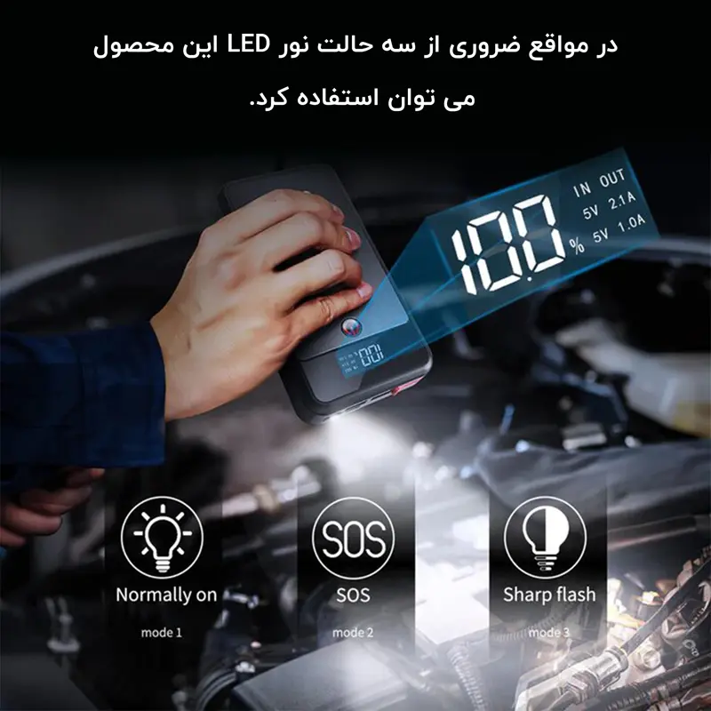 این پاوربانک دارای چراغقوه داخلی است که میتوانید در مواقع ضروری از سه حالت روشنایی آن استفاده کنید. همچنین این جامپاستارتر مناسب برای وسایل نقلیه 12 ولتی مانند ماشین، SUV، پیکاپ، کامیون، موتورسیکلت، قایق، ماشین برفی و حتی ماشین چمنزنی است. این جامپاستارتر قدرت استارتزنی خودروهای بنزینی تا حجم موتور 6 لیتر و خودروهای دیزلی تا حجم موتور 4500 سیسی را دارد.