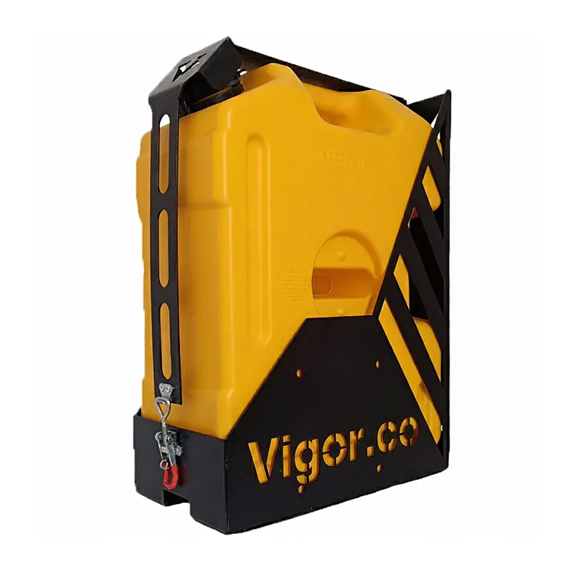 بدنه پایه گالن ویگور از ورق آهنی ۲ میلیمتری ساخته شده که استحکام بالایی در برابر فشار، ضربه و خوردگی دارد همچنین برای استفاده در مسیرهای خطرناک و ناهموار آفرودی مناسب است. رنگ الکترواستاتیک مشکی چرمی بهکاررفته روی سطح این پایه ، علاوه بر ایجاد ظاهری حرفهای، پایه را در برابر خط وخش، رطوبت، بارندگی و زنگزدگی محافظت میکند. این ترکیب باعث میشود پایه در شرایطی مانند گردوغبار کویر، رطوبت جنگل، باران جادهای و شستوشوی مداوم، ظاهر خود را حفظ کرده و برای استفاده طولانی مدت گزینهای مطمئن برایتان باشد.