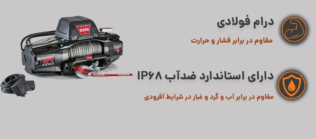 بدنه و ساختار کلی این وینچ با استاندارد IP68 طراحی شده که مقاومت کامل در برابر نفوذ آب، گردوغبار، گل و رطوبت را تضمین میکند. این سطح از آببندی، برای استفاده در شرایط سخت محیطی مانند عبور از رودخانه، بارندگی شدید، مسیرهای گلی یا ساحلی کاملاً مناسب میسازد. درام فولادی، صفحه اتصال آلومینیومی یکتکه و کیفیت ساخت بالای قطعات داخلی، نشان میدهد این وینچ برای استفاده بلندمدت طراحی شده است.