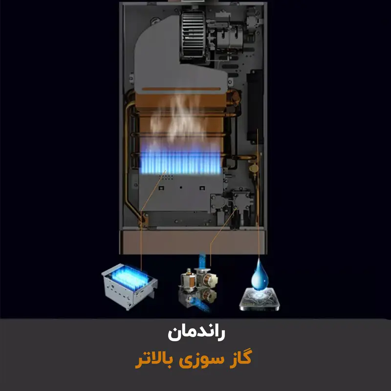 این آبگرمکن دارای سیستم جرقهزنی و کنترل برقی احتراق و دماست که برق موردنیاز خود را از باتری تأمین میکند. به کمک ترموستات برقی میتوان دمای آب را روی درجه دلخواه تنظیم کرد و از طریق نمایشگر دیجیتال روی بدنه، دمای آب را مشاهده نمود.